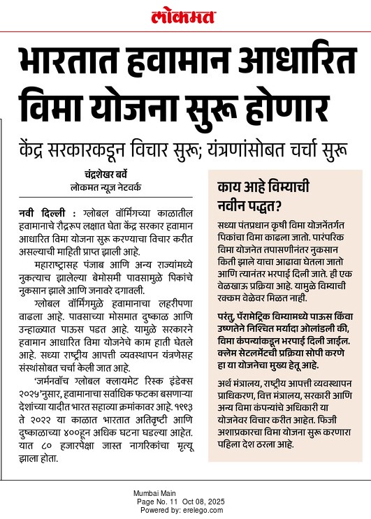 शेतकऱ्यांसाठी एक दिलासादायक बातमी म्हणजे ‘ग्लोबल वॉर्मिंग’च्या काळात हवामानाचे रंध्रूप लक्षात घेऊन केंद्र सरकार लवकरच ‘हवामान आधारित पीक विमा’ योजना (वेदर बेस्ड क्रॉप इन्शुरन्स) सुरू करण्यावर विचार करत आहे. सध्याची पीक विमा योजना पिकांचे नुकसान झाल्यावर पंचनामा करून भरपाई देते, जी एक वेळखाऊ प्रक्रिया आहे. या नवीन योजनेत ठराविक हवामान (उदा. ठराविक मर्यादेपेक्षा जास्त किंवा कमी पाऊस) झाल्यास, नुकसान न तपासता थेट विमा भरपाई दिली जाईल. यामुळे क्लेम सेटलमेंटची प्रक्रिया सोपी होईल. भारत अशी विमा योजना सुरू करणारा जगातील पहिला देश ठरणार आहे.